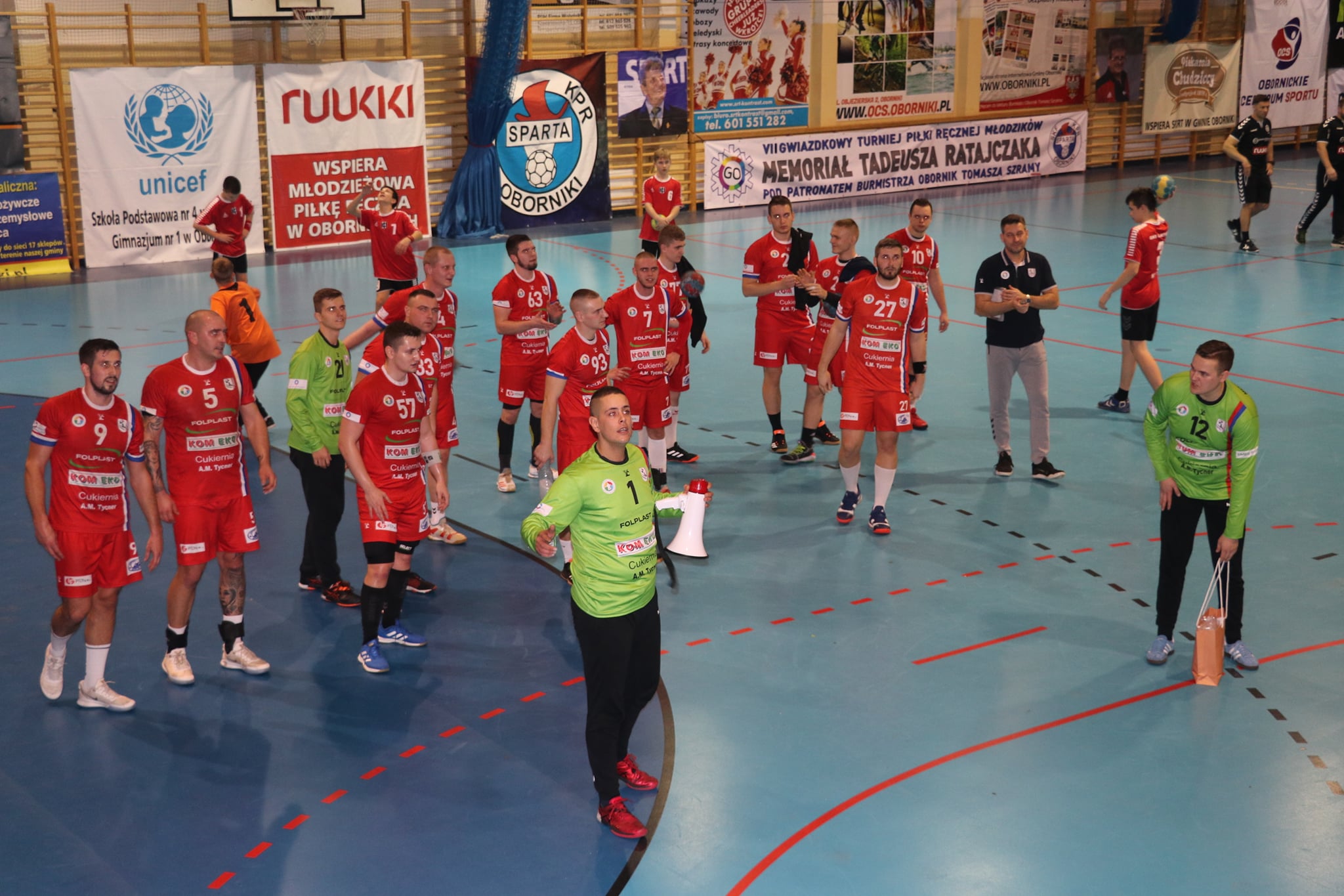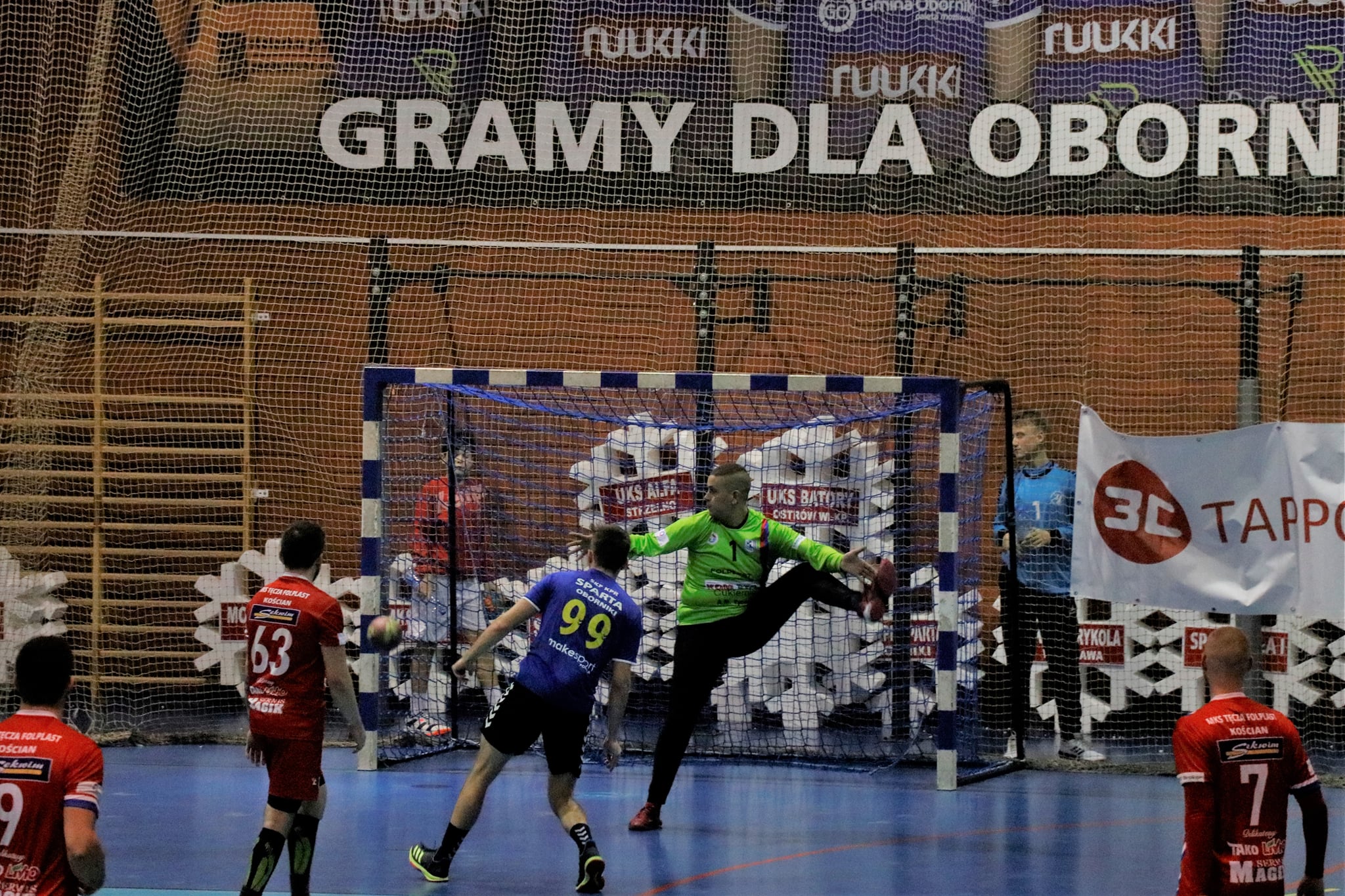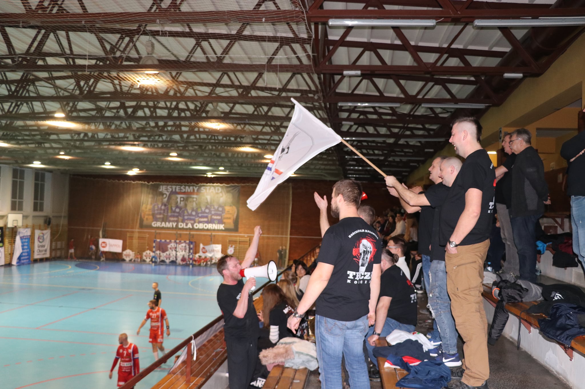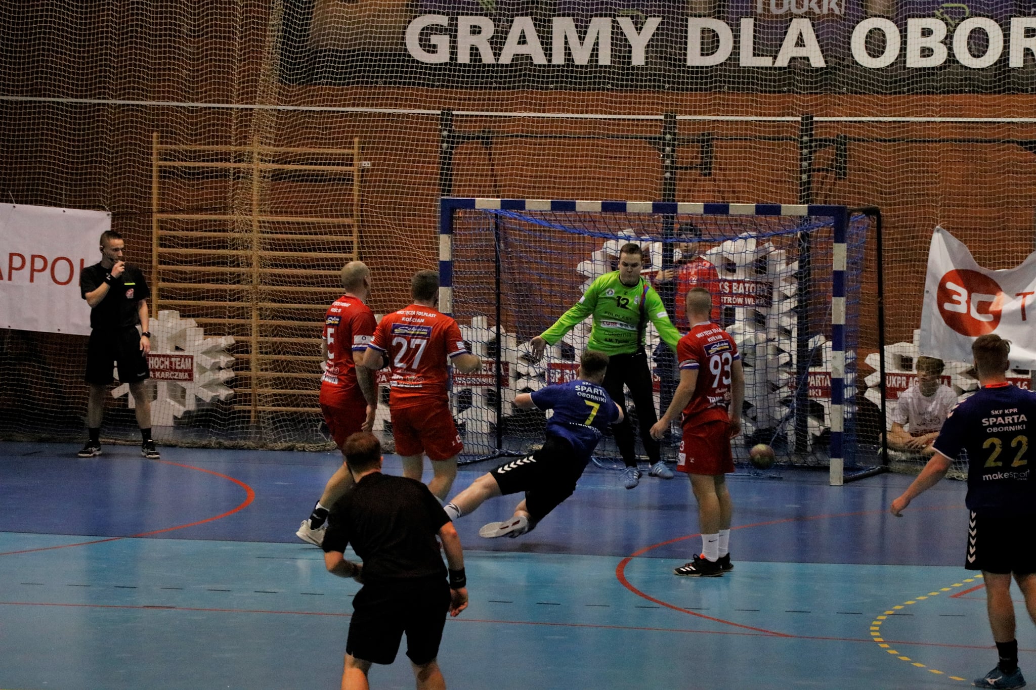 Przy dużym wsparciu z trybun mecz doskonale rozpoczęli nasi, którzy szczelnie zamurowali bramkę i nie pozwolili gospodarzom na bramkę z gry aż do 13 minuty! Gdyby nie bramka z karnego, wygrywalibyśmy tę część meczu 6:0! Wspaniała postawa w tej połowie zaowocowała powiększeniem przewagi aż do 8 bramek! Aby uzmysłowić jak znakomicie funkcjonowała obrona tego dnia, powiem tylko tyle, że na 5 zdobytych bramek 3 były z karnych! Czyli tak naprawdę Sparta Oborniki rzuciła przez 30 minut zaledwie 2 bramki!!! Bohaterem zdecydowanie Noskowiak, który będzie się śnił zawodnikom Sparty jeszcze bardzo długo! Na trybunach w sektorze gości prawdziwe święto – Kościańska Hałastra cały mecz na stojąco, a śpiewom i oklaskom nie było końca! Po pierwszej połowie na tablicy wyników 5:13!