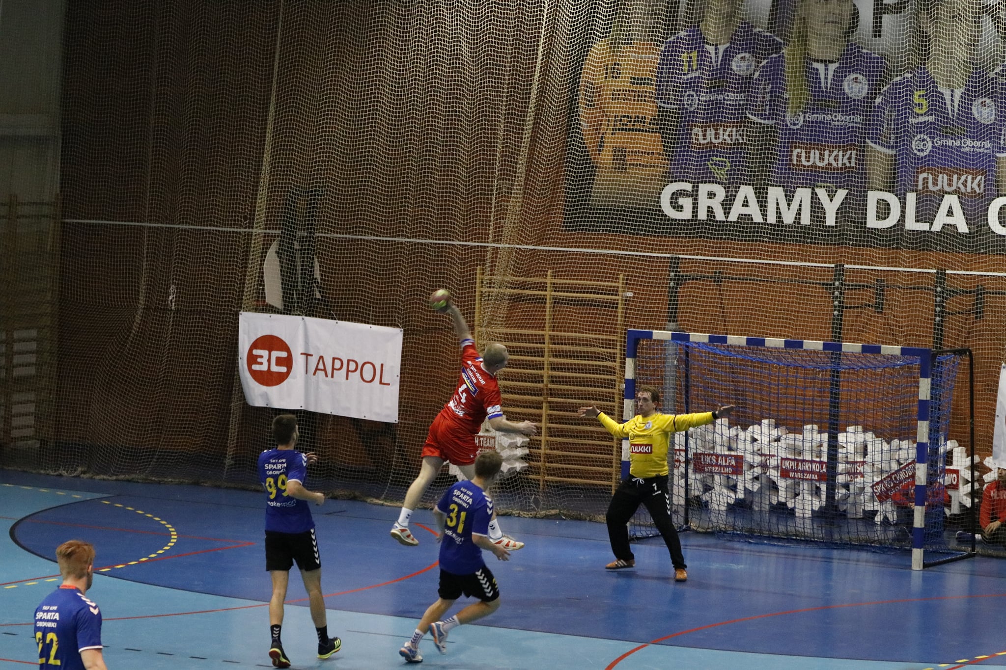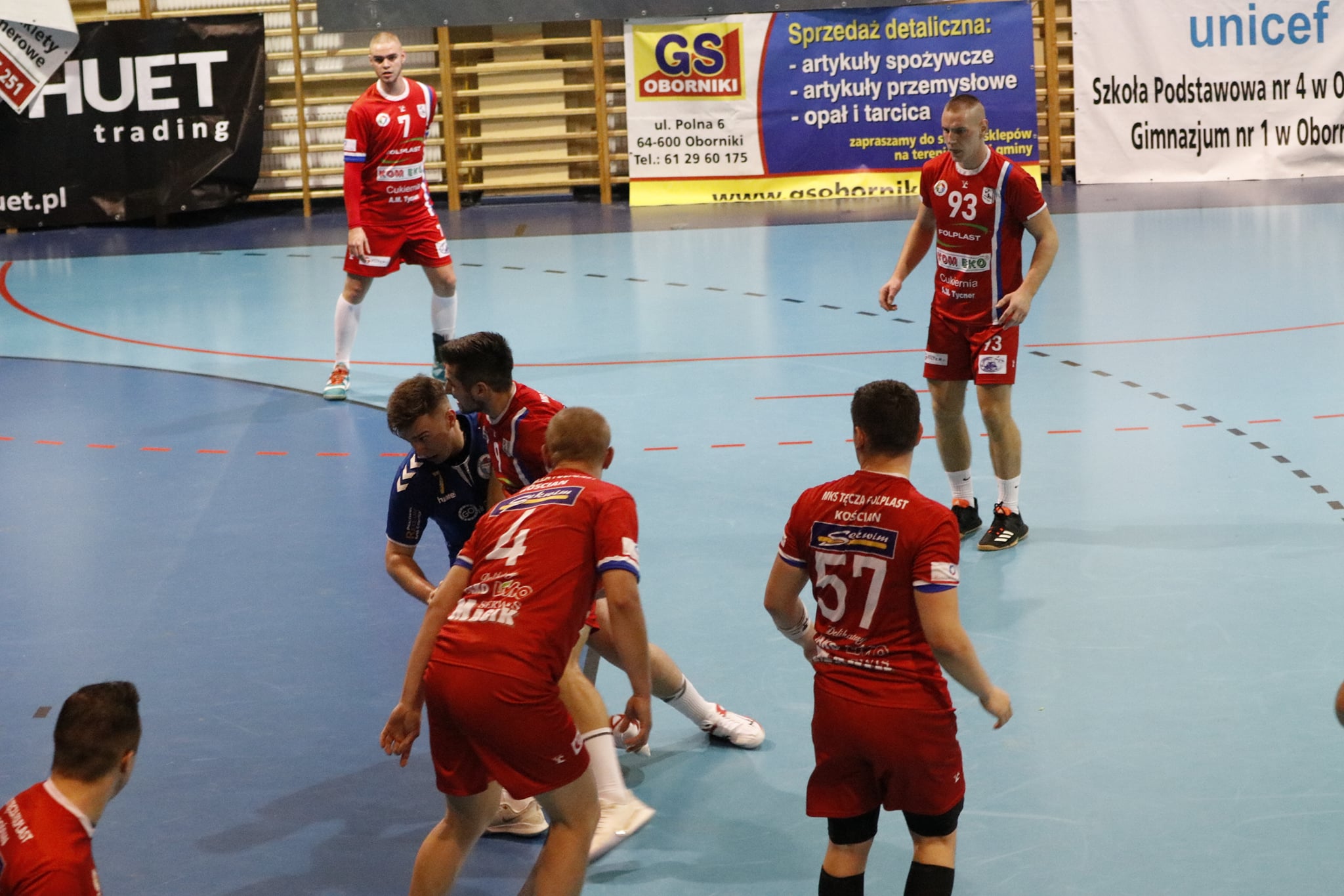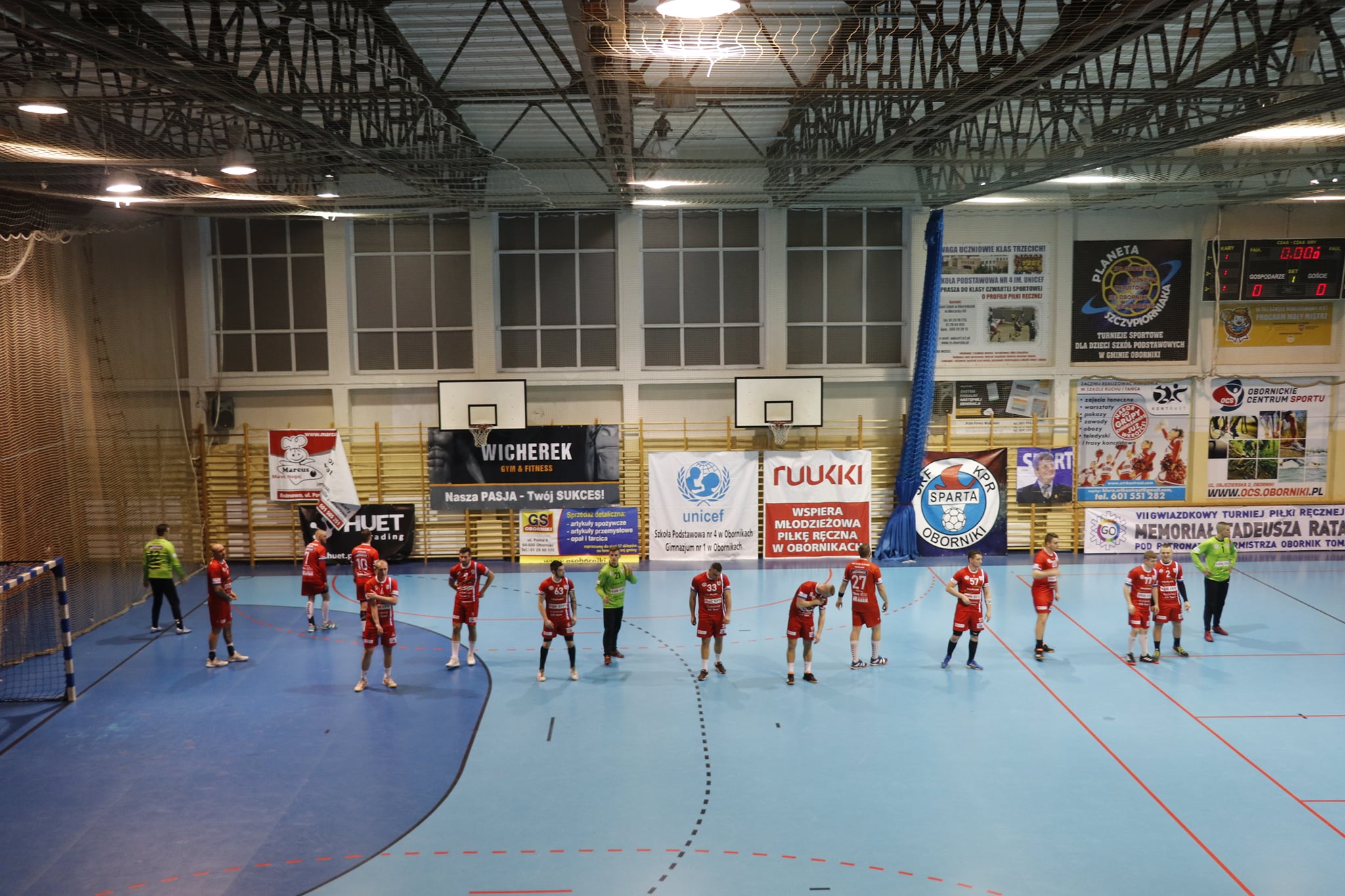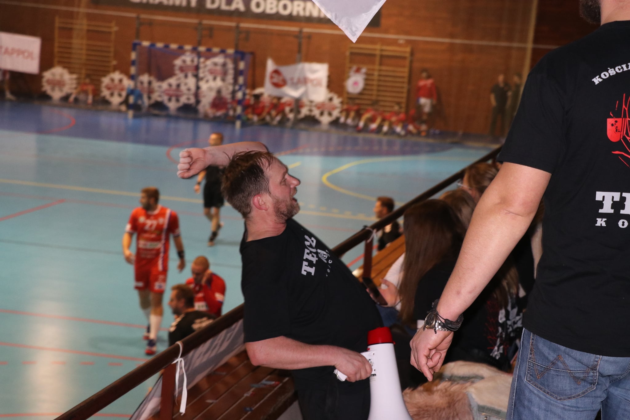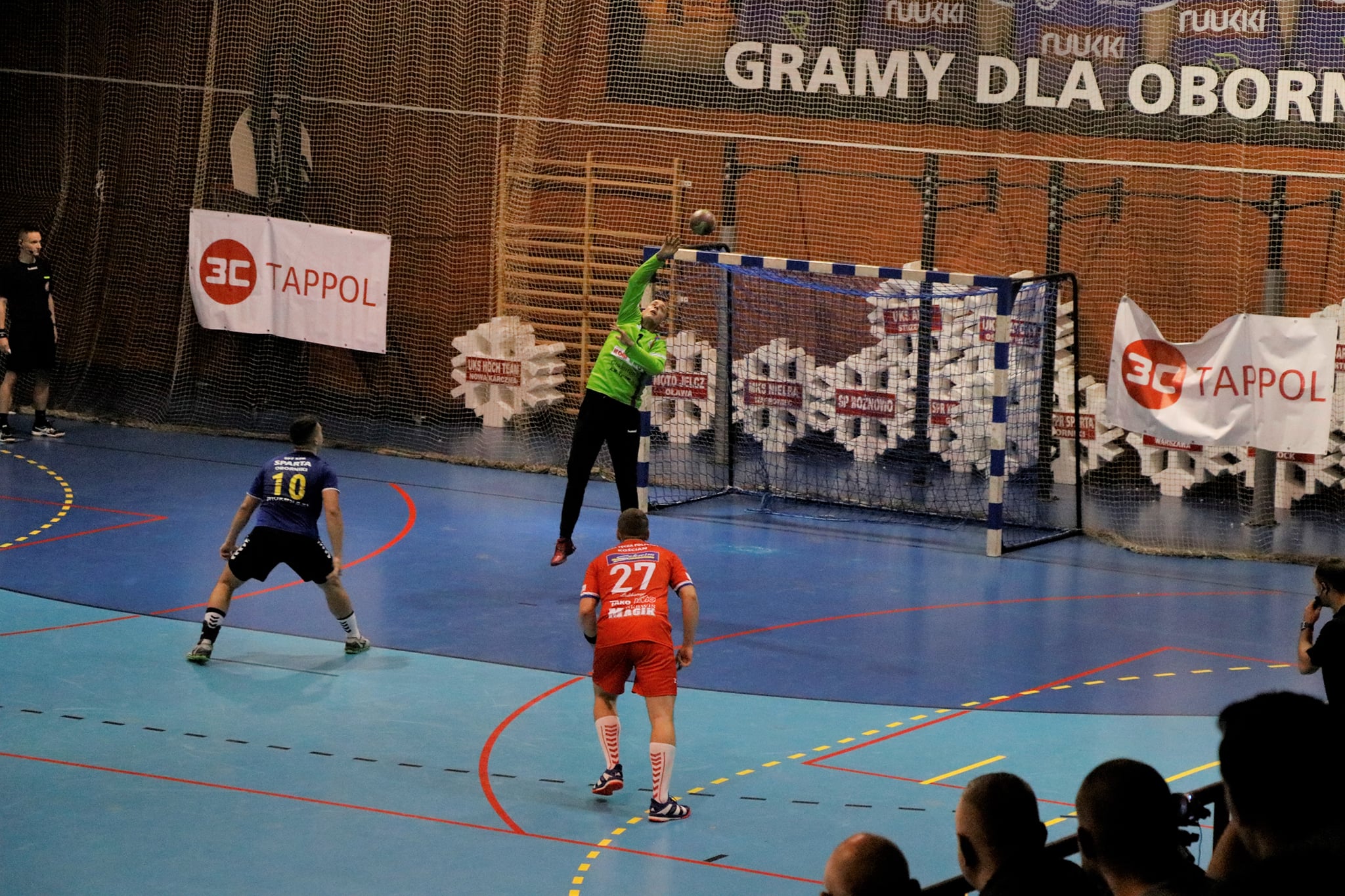 Przy dużym wsparciu z trybun mecz doskonale rozpoczęli nasi, którzy szczelnie zamurowali bramkę i nie pozwolili gospodarzom na bramkę z gry aż do 13 minuty! Gdyby nie bramka z karnego, wygrywalibyśmy tę część meczu 6:0! Wspaniała postawa w tej połowie zaowocowała powiększeniem przewagi aż do 8 bramek! Aby uzmysłowić jak znakomicie funkcjonowała obrona tego dnia, powiem tylko tyle, że na 5 zdobytych bramek 3 były z karnych! Czyli tak naprawdę Sparta Oborniki rzuciła przez 30 minut zaledwie 2 bramki!!! Bohaterem zdecydowanie Noskowiak, który będzie się śnił zawodnikom Sparty jeszcze bardzo długo! Na trybunach w sektorze gości prawdziwe święto – Kościańska Hałastra cały mecz na stojąco, a śpiewom i oklaskom nie było końca! Po pierwszej połowie na tablicy wyników 5:13!