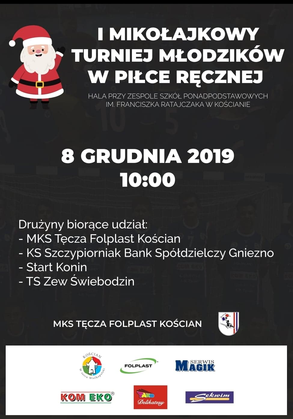 Mecenasami i osobami wspierającymi dzisiejszy I Mikołajkowy Turniej Piłki Ręcznej Młodzików (rocznik 2005 i młodsi) były firmy oraz osoby zasłużone dla kościańskiego szczypiorniaka. Dzięki hojności i bezinteresownemu zaangażowaniu udało się zorganizować ten pierwszy (i mam nadzieję od tej pory cykliczny) turniej. A zatem bardzo dziękujemy: