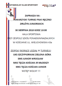 Zapraszamy 30-08-2018r  godz 10:00 na Towarzyski Turniej Piłki Ręcznej Drużyn Juniorskich który odbędzie się w Kościanie . Będzie to sprawdzian naszych zespołów w kwestii przygotowawczej do sezonu ligowego 2018/2019 .Serdecznie zapraszamy do kibicowania!!!!